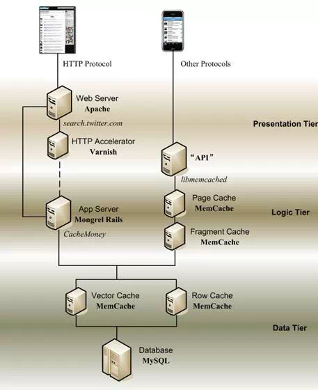 訪問twitter的用戶除了網頁(web通道),還有手機(API通道),而后者的比例占總流量的80%-90%。mysql cache之外,cache的重心會在API通道上。手機屏幕的主體,是一屏一屏的消息,不妨把整個頁面分割成若干局部,每個局部對應一些/一條消息,這些就是fragment。人氣高的作者,緩存其頁面的fragment,可以提高讀取其發布消息效率,這就是fragment cache的使命。人氣旺的作者,人們也會訪問其主頁,這就是page cache的使命。實際結果,fragment cache的命中率為95%,page cache為40%。雖然page cache的命中率低,但由于是訪問主頁,其占用的空間是很大的,為了防止兩種cache相互影響,這兩種cache需要部署在不同的物理機器上。twitter的fragment cache和page cache都是使用的memcached。