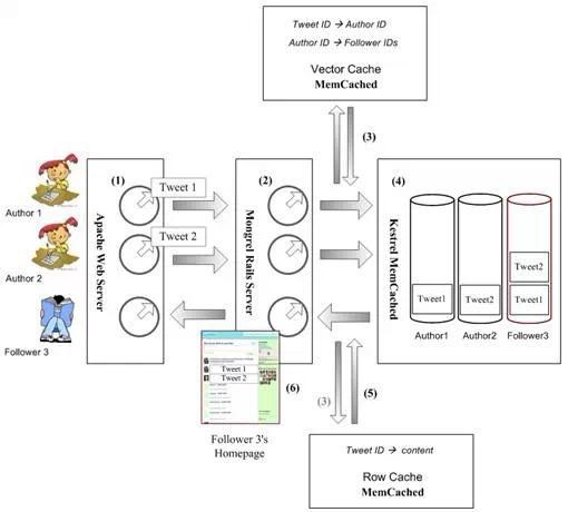 (5)某一臺Mongrel,它可能正在處理某一個id的隊列,就會往返回該id用戶的主頁上添加上此條信息;(6)Mongrel將更新后作者的主頁給前端等待著的apache,apache則返回瀏覽器。