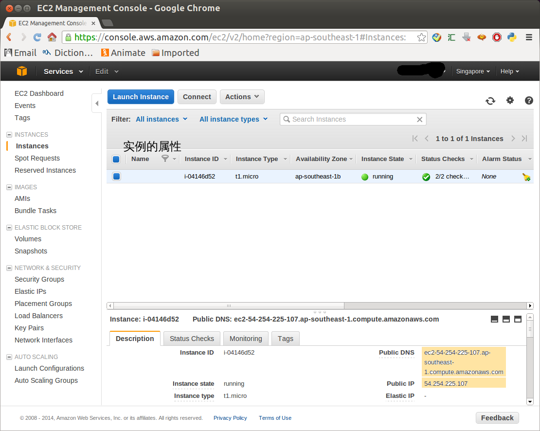 在EC2頁面的菜單中選擇Instances,可以查看已經(jīng)創(chuàng)建的所有實(shí)例及其相關(guān)屬性。左鍵點(diǎn)擊某個(gè)實(shí)例,可以從下面的窗口看到相關(guān)的信息,比如實(shí)例的域名和IP地址: