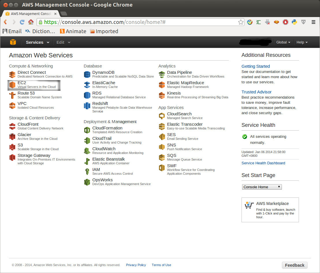 注冊(cè)完成后,依然從"My Account / Console"菜單,進(jìn)入管理面板(Amazon Management Console)。AWS的大部分云服務(wù)都列在這里,包括我們后面要使用的EC2。