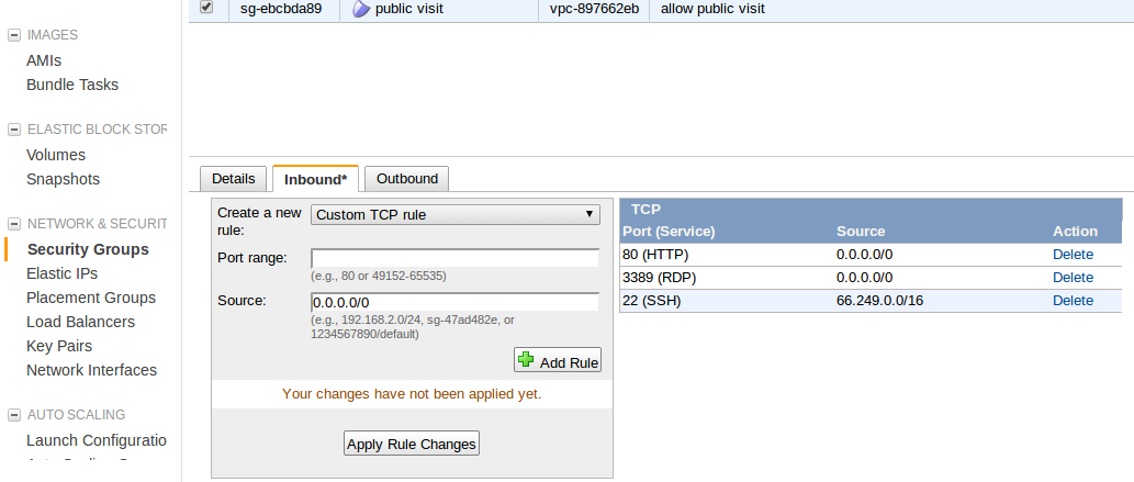 這里主要說明Security Groups的訪問權(quán)限設(shè)置。我們剛才在創(chuàng)建實(shí)例中,允許所有的IP訪問SSH端口。由于我們的目的是架設(shè)一個(gè)WordPress的Web站點(diǎn),我們還需要開放80和3389端口。