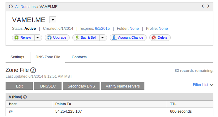 點(diǎn)擊vamei.me一行的Launch按鈕,進(jìn)入vamei.me域名的詳情頁面。選擇修改DNS Zone File。將一開始的A Host的IP地址,改為實(shí)例的IP地址: