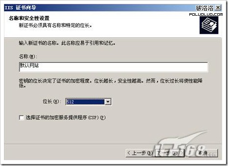 第七步:設置證書的名稱和特定位長,名稱保持默認網站即可,在位長處我們通過下拉菜單選擇512。