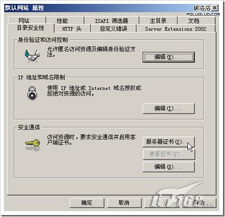 第一步:在默認網站屬性窗口中點“目錄安全性”標簽,然后在安全通信處點“服務器證書”按鈕。