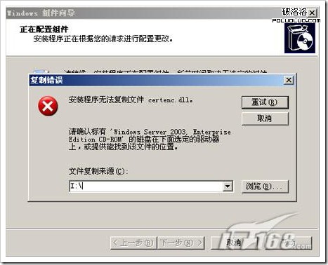 第十步:安裝過程中會出現缺少文件的提示,我們需要將windows2003系統光盤插入光驅中才能繼續。