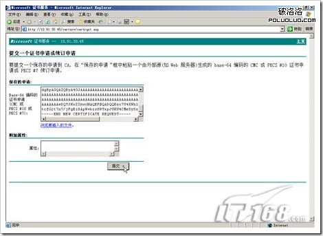 第六步:將復制的全部內容粘貼到“提交一個證書申請或續訂申請”界面,然后點“提交”按鈕。