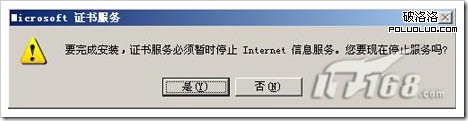 第八步:下一步后出現“要完成安裝,證書服務必須暫時停止IIS服務”的提示。選擇“是”后繼續。