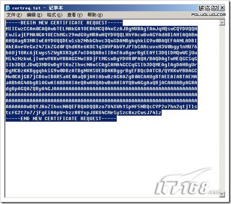 第五步:用記事本打開上面保存在桌面上的那個certreq.txt文件,將里面的內容全部復制。