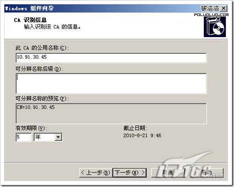 第六步:CA識別信息處的CA公用名稱輸入本地計算機的IP地址,如10.91.30.45,其他設置保留默認信息即可。