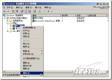 第二步:在默認網站上點鼠標右鍵選擇“屬性”。