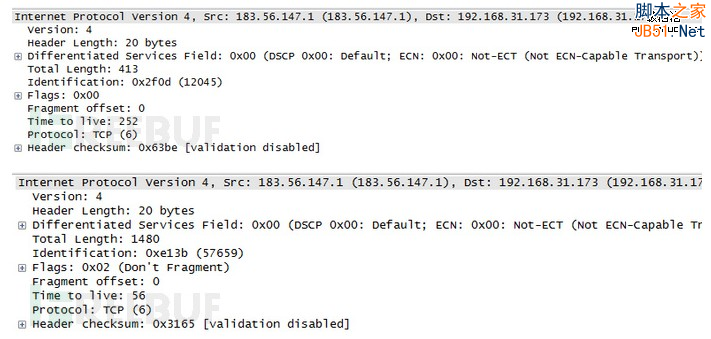 第一個包TTL值是252,第二個包TTL值是56,而之前TCP三次握手時京東服務器的TTL值是56,故可以判斷先到的包是偽造的,真的包晚到而被系統忽略。