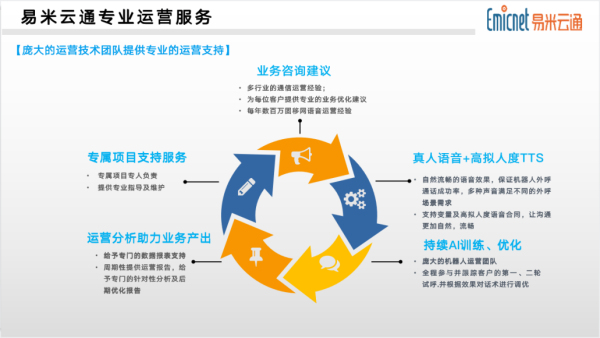 作為自主研發AI人工智能+SaaS語音服務前沿科技的專業智能語音平臺服務商--易米云通始終堅持以“人工智能來源于人,服務于人”的理念,提供人機結合后的語音產品,通過大量自然對話訓練后的細分行業知識圖譜、無縫人機協作、高危識別/多意圖識別等功能,結合自然人類在抽象理解能力、想象力、創造力等方面的天然優勢和語音機器人在執行速度、準確性和邏輯上的優勢,為企業人效比的提升帶來助力。