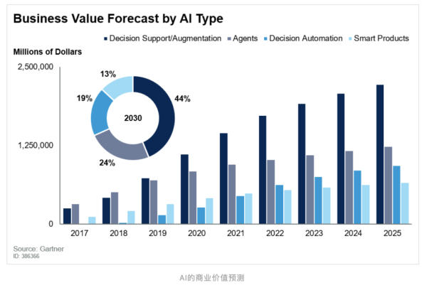 據Gartner預測,“到2020年,20%從事后臺活動的銀行運營員工將依靠AI從事非常規的工作;到2021年,人工智能增強將在全球創造2.9萬億美元的商業價值和62億小時的工人生產力”。