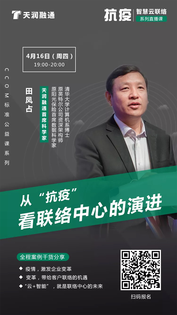天潤融通賦能多家企業(yè)聯(lián)絡(luò)中心云化和智能化,“抗疫”而上。4月16日(周四)19:00,易訓(xùn)(中國)管理研究院聯(lián)合天潤融通共同舉辦【從“抗疫”看聯(lián)絡(luò)中心的演進(jìn)】公益課,和大家分享疫情給客戶聯(lián)絡(luò)帶來的機(jī)遇、智慧云聯(lián)絡(luò)中心“抗疫”案例。