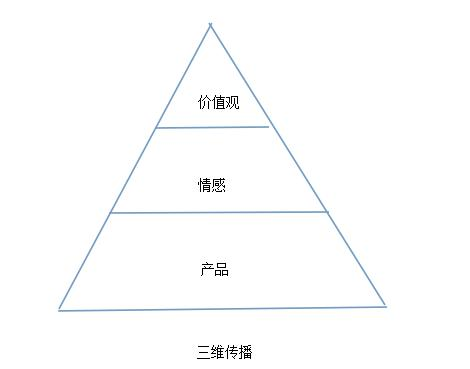 品牌傳播的三個維度即產品傳播、情感傳播、價值觀傳播。產品傳播僅僅圍繞產品,基本的如產品獨特的功能、亮點,硬件速度如何快,界面如何流暢,再延伸如產品的行業趨勢傳播,比如常用的搶購、秒殺,制造熱銷和饑餓感,打造產品潮流感。