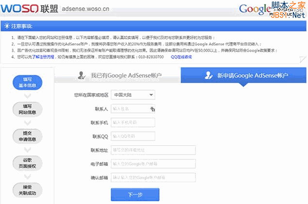 擁有賬號之后,我們進入我搜聯(lián)盟的Google Adsense帳戶注冊,填入信息,就像下面這樣