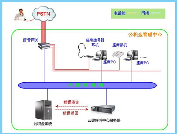 - 硬件:語音網關、話機、耳麥、云翌呼叫中心服務器(客戶自備PC電腦、電話線路、以及現有的公積金系統)。