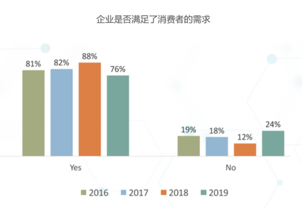 當被問及“企業是否滿足了消費者的需求?”,2019年調查的結果僅為76%,是數據中有史以來最低的肯定回答。 造成這種結果的原因可能是行業內部以及消費者期望之間的不斷變化。
