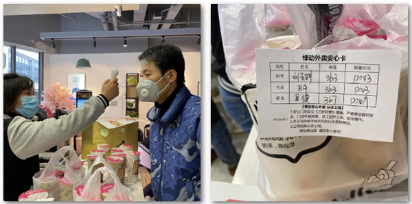 在管理上,員工每天測溫上崗,全程口罩防護,門店環境、器皿定時消毒,使用免排隊小程序點單。外賣騎手測溫防護,上線“安心卡”安全管理,全程無接觸外賣配送。