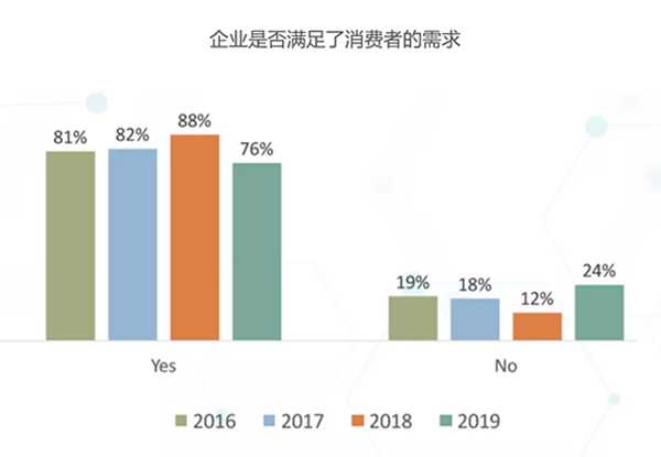 當被問及“企業是否滿足了消費者的需求?”,2019年調查的結果僅為76%,是自2014年以來回答“是”的企業占比最少的一次。造成這種結果的原因可能是行業內部以及消費者期望之間的不斷變化。