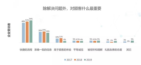 當被問及“除解決問題外,對顧客什么最重要?”,54%的企業受訪者選擇“快速簡便的流程”。但是,當消費者被問到類似的問題時,結果揭示出一些不同的觀點。