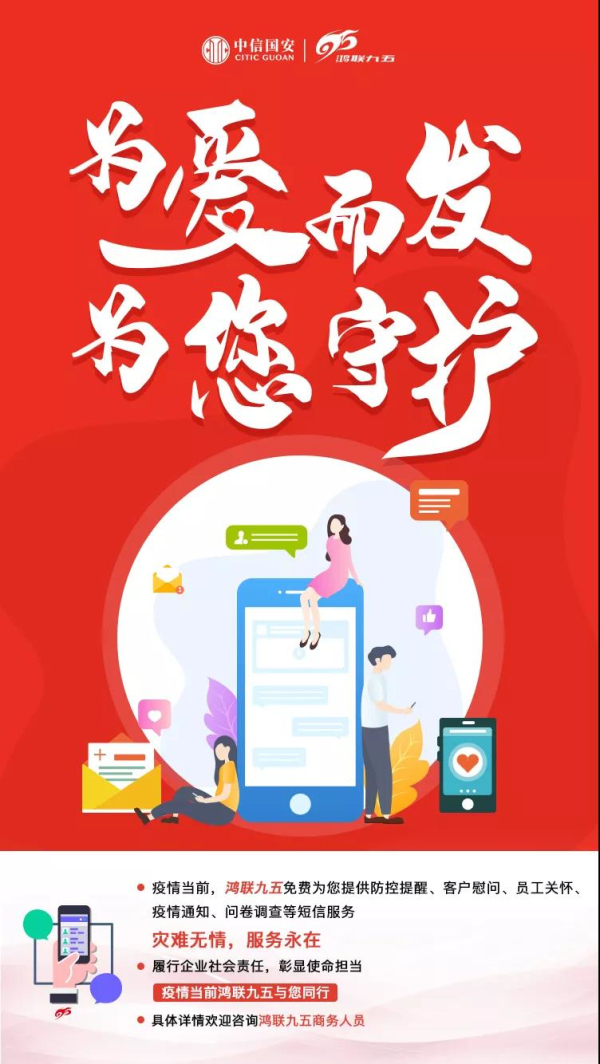 鴻聯九五短信平臺三網并發,分秒必達,隨時隨地服務客戶、完成員工通知,隔離的是病毒而不是愛與服務。