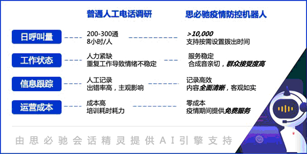 針對這一困境,思必馳推出“疫情防控機器人”,在疫情期間向全國相關政府部門、醫療機構、公益機構提供免費人工智能服務,可替代社區人力,向海量轄區居民主動撥打電話,調研近期行蹤、摸排人員往來,加強重點人員健康監測和跟蹤保障。