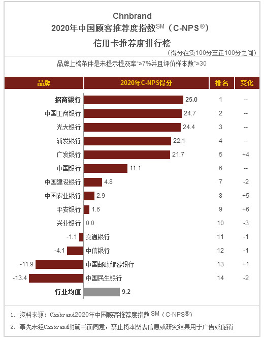 服務革新直接提升用戶體驗,在2020年1月發布的2020年(第六屆)中國顧客推薦度指數(C-NPS)品牌排名和分析報告上,招行信用卡再次榮膺第一。