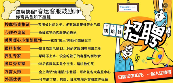 2020年春運大幕開啟,攜程宣布7萬元招聘“春運客服鼓勵師”,該崗位要求懂方言會外語、能按摩擅養生、會搞笑講段子、懂95后“黑話”等復合技能,幫1.5萬名客服度過一年中最繁忙的春運周期。