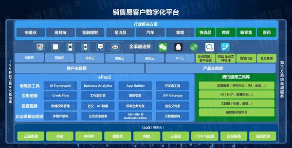 銷售易創始人兼CEO曾提到:目前銷售易的產品體系結構是PaaS平臺+基于平臺構建的云產品,將前端共用的功能連接到PaaS平臺上。在去年9月召開的Engage2019大會上,銷售易推出“客戶數字化平臺”,這是銷售易與騰訊深度合作的成果,構建了從營銷到獲客到服務客戶的一站式平臺,不僅包含了EngageSuite的應用層產品,還囊括了PaaS、IaaS等基礎設施與服務,以及第三方合作生態,這種從底層架構到前臺端口的全方位整合有效解決了企業自行開發成本高、迭代難的問題,以及業務部門各自購買IT服務帶來的“煙囪式”數據孤島困境。