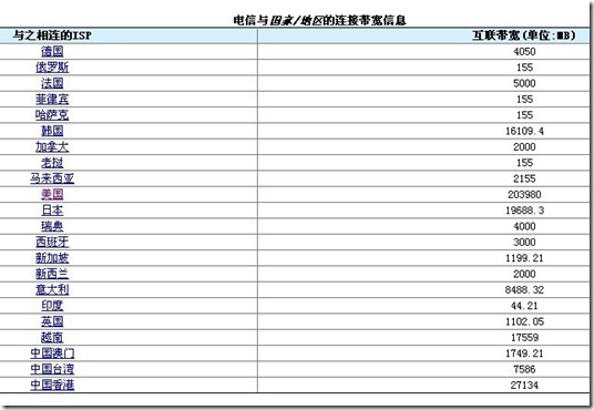(截至2008年的出口帶寬上限,很明顯到美國的出口帶寬最多,當然看了這個表,不要驚訝,如到俄羅斯出口帶寬只有115MB,印度只有44MB,不要懷疑自己的眼睛,可以自己點上面鏈接去看)