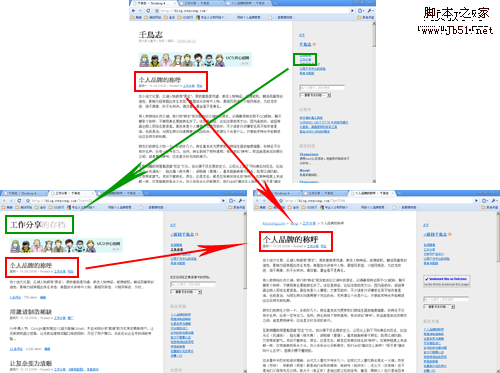 UCDChina官方博客也有類似問題,其癥結在于前后頁面布局不當。按理說,不同層級頁面所突出的核心內容應該不同,所以首屏也應該有明顯差異才對。我設計自己博客首頁、列表頁、網志頁布局時,就特別注意了它們之間的傳達關鍵點差異,如此在較快的交互時會有“動畫”效果。下圖上為首頁首屏,左為列表頁首屏,右為網志頁首屏。