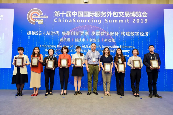 遠傳新業創新事業部總經理張輝(右6)榮獲2019中國數字服務暨服務外包杰出貢獻人物“客戶中心領域領軍人物”。