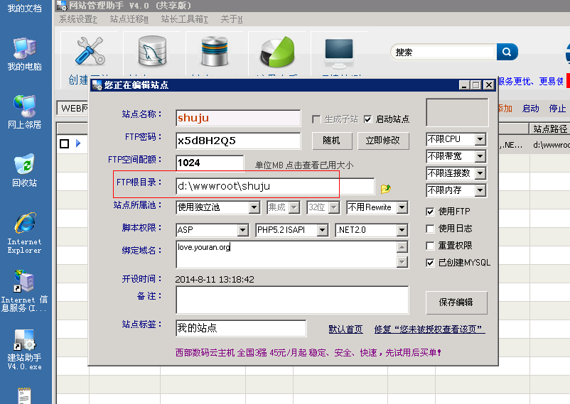 我們還是先打開“建站助手”看看我們創建的網站信息,如下圖所示: