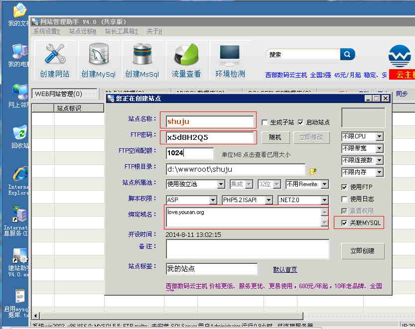 E:這里選擇就表示創建這個網站的同時,也創建一個對應的MYSQL數據庫,一般是建議勾選上.