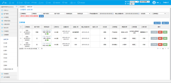 云翌IP呼叫中心可在彈屏頁面、客戶列表、在線客服頁面新建提交工單,系統默認7種工單狀態(未分配、已分配、處理中、已完成、已關閉、已取消、已刪除),處理耗時告警工單可查看和操作超過24小時未分配的工單信息以及超過48小時未解決的工單。
