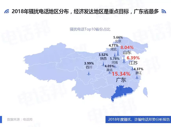 4、2018年騷擾電話地區(qū)分布,經(jīng)濟發(fā)達地區(qū)是重點目標,廣東省最多