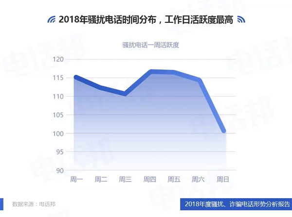 電話邦以一周時間為周期,對騷擾電話進行了統(tǒng)計分析,結(jié)果顯示騷擾電話整體活躍度無明顯峰值,除去周日活躍度最低,其他時間的活躍度比較平均,主要是工作日活躍度最高。