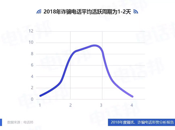 電話邦通過對詐騙電話深入分析發(fā)現(xiàn),2018年詐騙號碼的平均活躍周期為1-2天,這說明詐騙電話的治理速度得了極大的提升,一個號碼在被用作詐騙后,在1-2天內(nèi)就能得到處理,與2017年5-8天的活躍期相比,呈現(xiàn)大幅度下降趨勢。