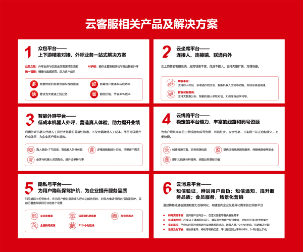云客服平臺(tái)通過(guò)整合上下游的優(yōu)勢(shì)產(chǎn)業(yè)資源,集成人工智能(AI)、大數(shù)據(jù)和融合通信等新技術(shù)能力,構(gòu)建眾包、智能、線(xiàn)路調(diào)度和云坐席等四大子平臺(tái),聯(lián)合國(guó)內(nèi)優(yōu)秀的外包服務(wù)公司,為企事業(yè)客戶(hù)和政府部門(mén)提供一站式的呼叫中心解決方案。自2018年10月18日上線(xiàn)以來(lái),已為多家客戶(hù)提供營(yíng)銷(xiāo)和客服服務(wù)。