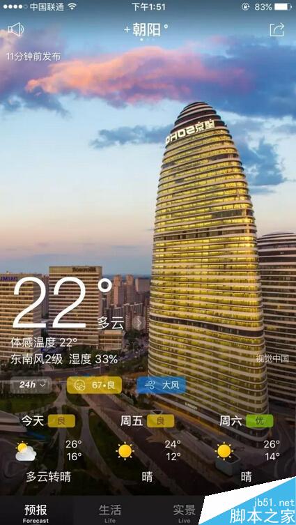 天氣通的背景圖片都很美,而且可以根據用戶所在的地理位置,展現附近的標志性建筑。比如,我就經常能刷到望京SOHO。