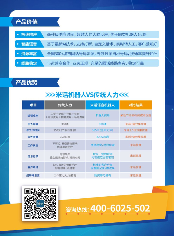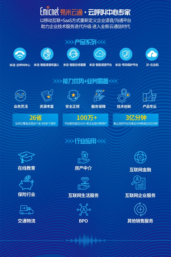 隨著云計(jì)算和人工智能的不斷發(fā)展,易米云通在2018年相繼推出云呼叫中心、智能語音機(jī)器人、智能在線客服、智能語音平臺、沃·云總機(jī)、號碼保護(hù)平臺等領(lǐng)先行業(yè)的系列產(chǎn)品與創(chuàng)新技術(shù)。截止到目前,易米云通的服務(wù)已經(jīng)覆蓋了全國26個(gè)省份、300多個(gè)城市、發(fā)展了100萬+企業(yè)級付費(fèi)用戶,承載的語音話務(wù)量已經(jīng)達(dá)到了每月近3億分鐘。