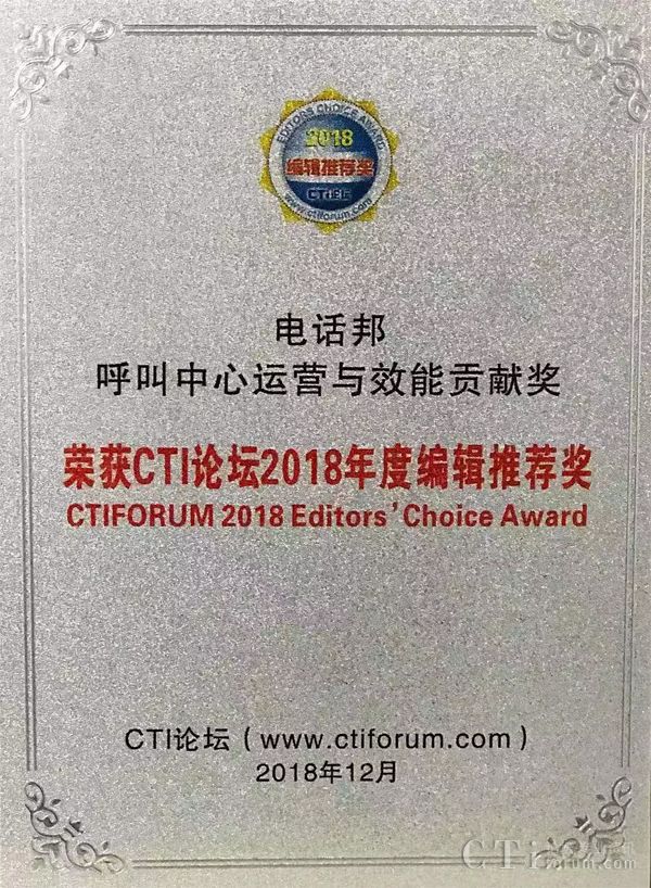 CTI論壇編輯推薦獎是由中國領先的信息和通信技術行業網站CTI論壇舉辦的年度ICT領域技術評選活動,評選范圍涵蓋主要ICT技術和產品應用。評選活動借助媒體獨特的視角,對本年度ICT領域出現的最新技術和熱門產品解決方案進行一次總結和集中展示,最后由專家評審決定各個獎項花落誰家。依托CTI論壇多年來積累的強大行業資源和經驗,經過一個月的激烈評選和廣泛考察,將這一榮譽授予了電話邦。
