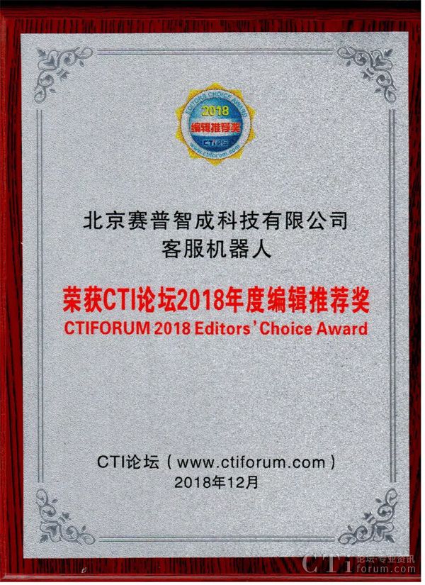 北京賽普智成科技有限公司深耕呼叫中心研發15余年,作為受邀公司,其產品“小賽智能客服機器人”憑借在人工智能行業卓越的創新力和強勁的增長實力,在此次活動中榮獲“CTI論壇2018年度編輯推薦獎”獎項。