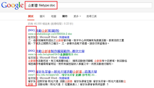 當(dāng)學(xué)生需要做報(bào)告、上班族需要查找資料的時(shí)候,我們常常需要找的是Word文件或者是PPT簡報(bào),該怎么搜尋特定副檔名?這時(shí)候可以直接在Google搜尋框內(nèi)輸入filetype:doc,搜尋出來的結(jié)果就會(huì)全部都是Word的文件檔啰!使用者可以依照需要自己輸入要搜尋的副檔名。