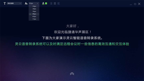 發(fā)言實時上屏:針對不同會議的需求,系統(tǒng)可將實時語音轉(zhuǎn)寫的結(jié)果,以彈幕的形式展現(xiàn)在大屏上,方便現(xiàn)場聽會者閱讀。