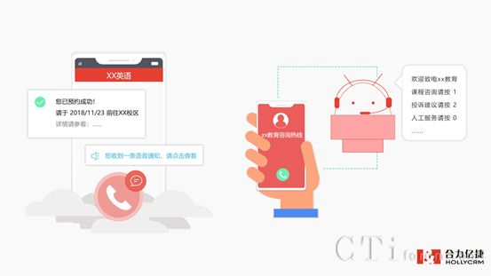 應用場景二:上課通知提醒。當家長/學員成功預約課程后,通過語音/文字的方式通知其上課的時間、地點等信息。合力億捷智能云客服系統可調用接口,自動呼叫成功預約課程的學員,并支持教育企業業務系統點擊外呼,支持短信發送通知等。