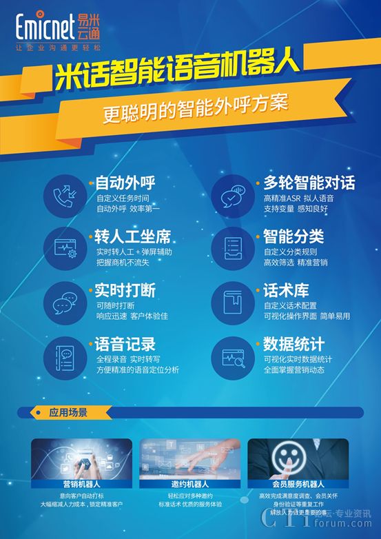 專注于以移動互聯+SaaS方式重新定義企業語音/溝通平臺的云通信服務提供商--易米云通,通過運用云通信+人工智能的科技手段,創新性地獨創了軟件定義企業語音網絡的方式,以能夠承載每年上百億分鐘的云語音交換平臺取代傳統的企業語音交換設備,并同時取代了傳統的企業呼叫中心平臺所需的排隊、CTI、錄音設備。