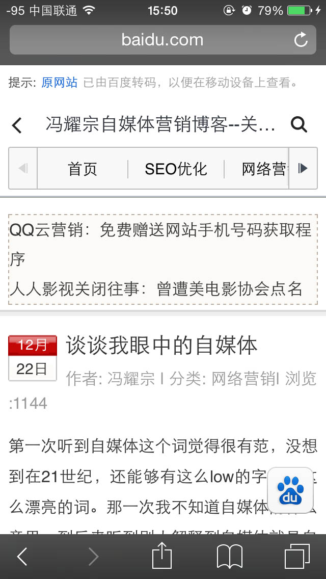 今天用手機(jī)搜索了我的網(wǎng)站進(jìn)去以后發(fā)現(xiàn)網(wǎng)站由百度轉(zhuǎn)碼成手機(jī)站,納悶了我的手機(jī)站做的好好的為何轉(zhuǎn)成了百度的手機(jī)站?回想一下百度官方的移動網(wǎng)站建設(shè)常見問題集錦,我誤以為是百度機(jī)器無法識別響應(yīng)式站點,我在搜索了其他網(wǎng)站,發(fā)現(xiàn)出現(xiàn)這樣的情況還不少,而且他們都有自己的手機(jī)站卻轉(zhuǎn)成了百度的站!