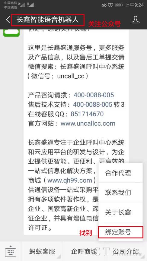 首先在微信中關注公眾號:長鑫智能語音機器人。關注公眾號后,進去公眾號主菜單,找到“綁定賬號”按鈕。跳轉(zhuǎn)綁定頁面,輸入需要綁定的賬號,點擊綁定。一個微信只能綁定一個賬號,綁定后的賬號可以在綁定頁面解綁。